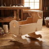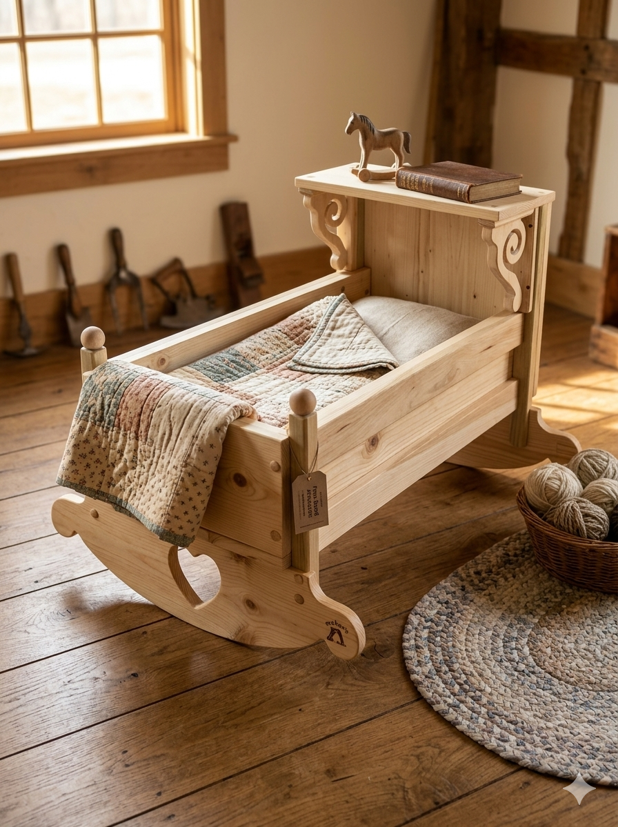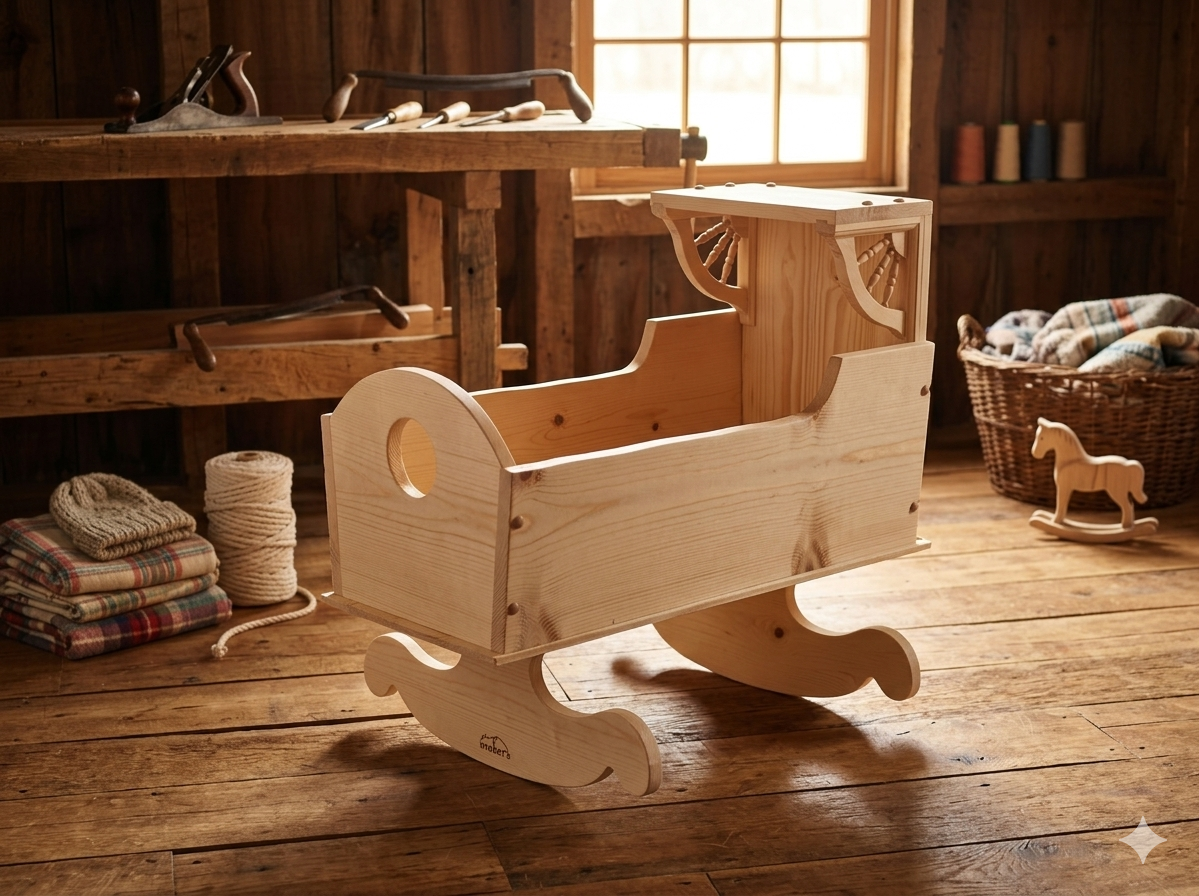 A handcrafted wooden baby cradle with classic curved rockers and rustic farmhouse detailing.