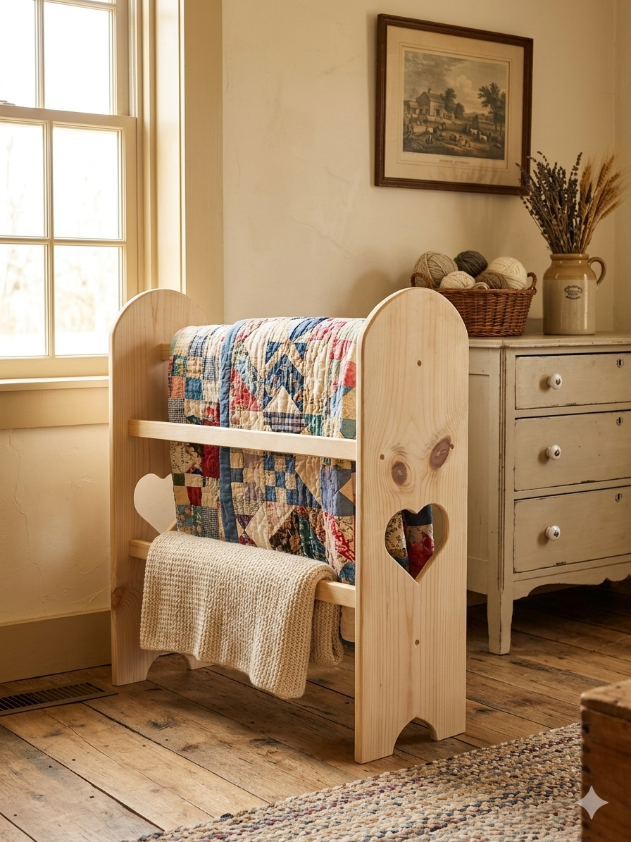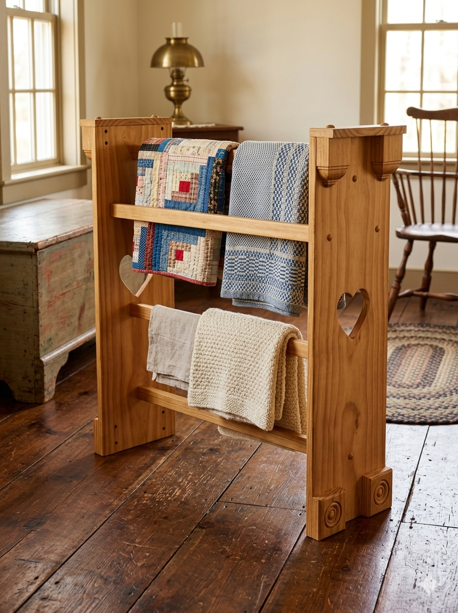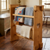 A handcrafted wooden quilt rack designed for displaying quilts, throws, and heirloom textiles.